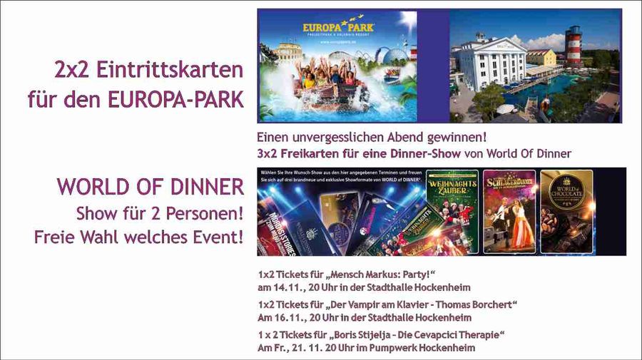 Schnelle Einsender haben Vorteile! Das hat folgenden Grund: Für Veranstaltungen (links in der Liste der Gewinne mit *gekennzeichnet), die zeitlich zu früh liegen, werden natürlich Vorab-Ziehungen erfolgen, damit die Gewinner sich noch rechtzeitig darauf vorbereiten können! Alle anderen Gewinne werden nach dem Einsendeschluss gezogen.